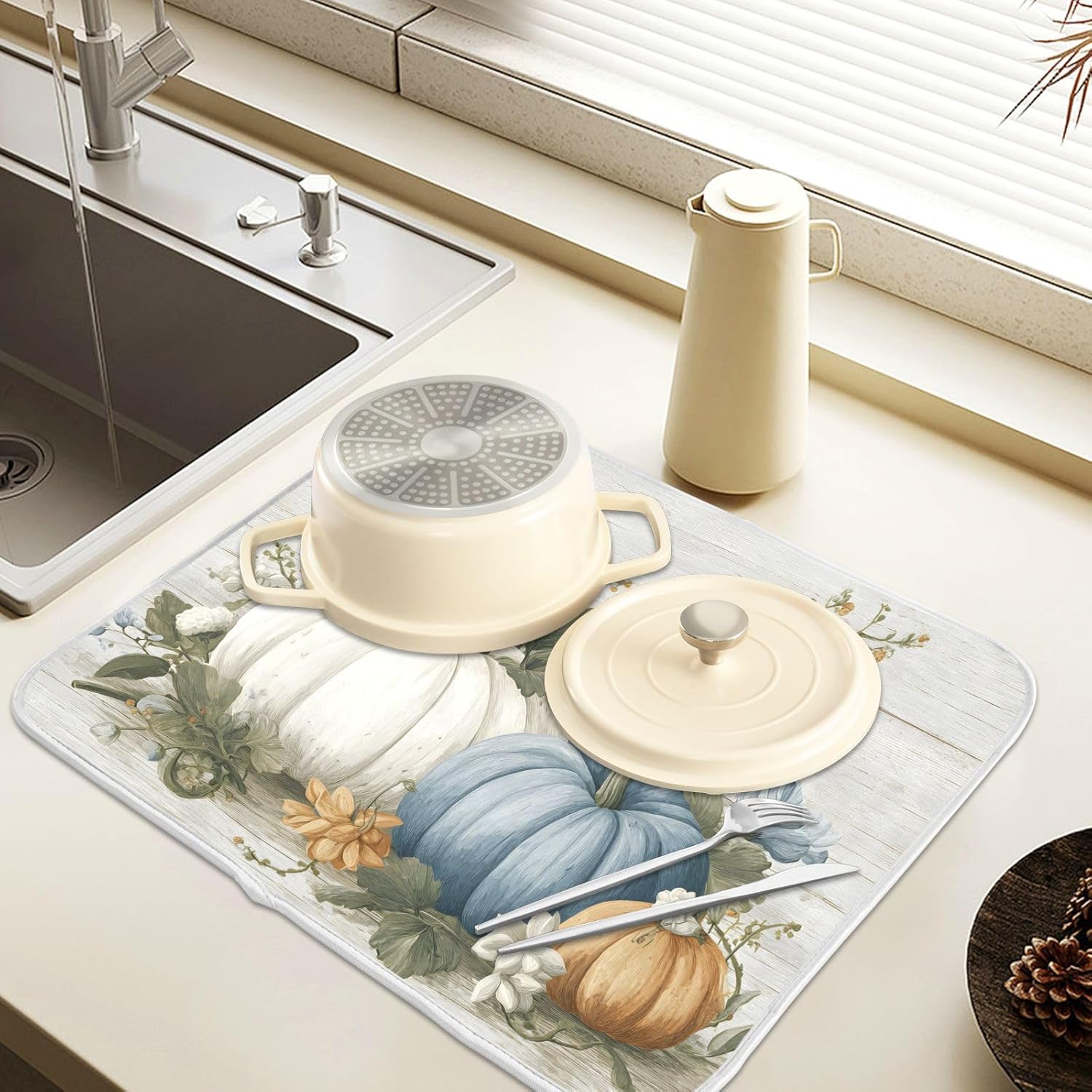 Fall Blue Orange Grey Pumpkin Thanksgiving Dish Drying Mat for Kitchen Counter Absorbent Microfiber Large Drying Pad Dish mats for Kitchen Countertops 18 x 24 Inch