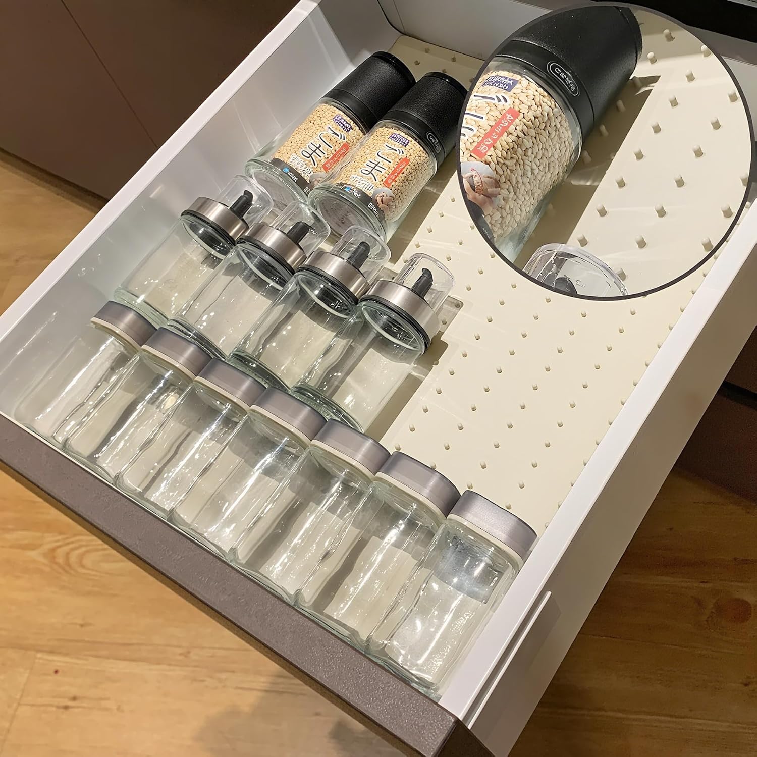 - 【Zero Sliding Guaranteed with Raised Dots】Spices Drawer Organizer made of Premium silicone material also the patented designe have raised points and grip-enhanced surface that helps keep seasoning jars in place, preventing them from sliding or shifting. so no worry spice bottles move all over in draw.