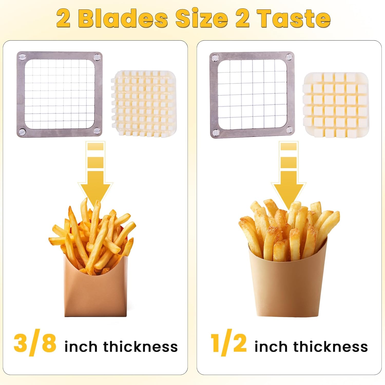 - 3 SHARP STAINLESS STEEL BLADES – Comes with three interchangeable blades (1/4" Shoestring, 3/8" Classic, 1/2" Wide Fry) for restaurant-quality fries every time. Easily switch sizes for any recipe or preference.
