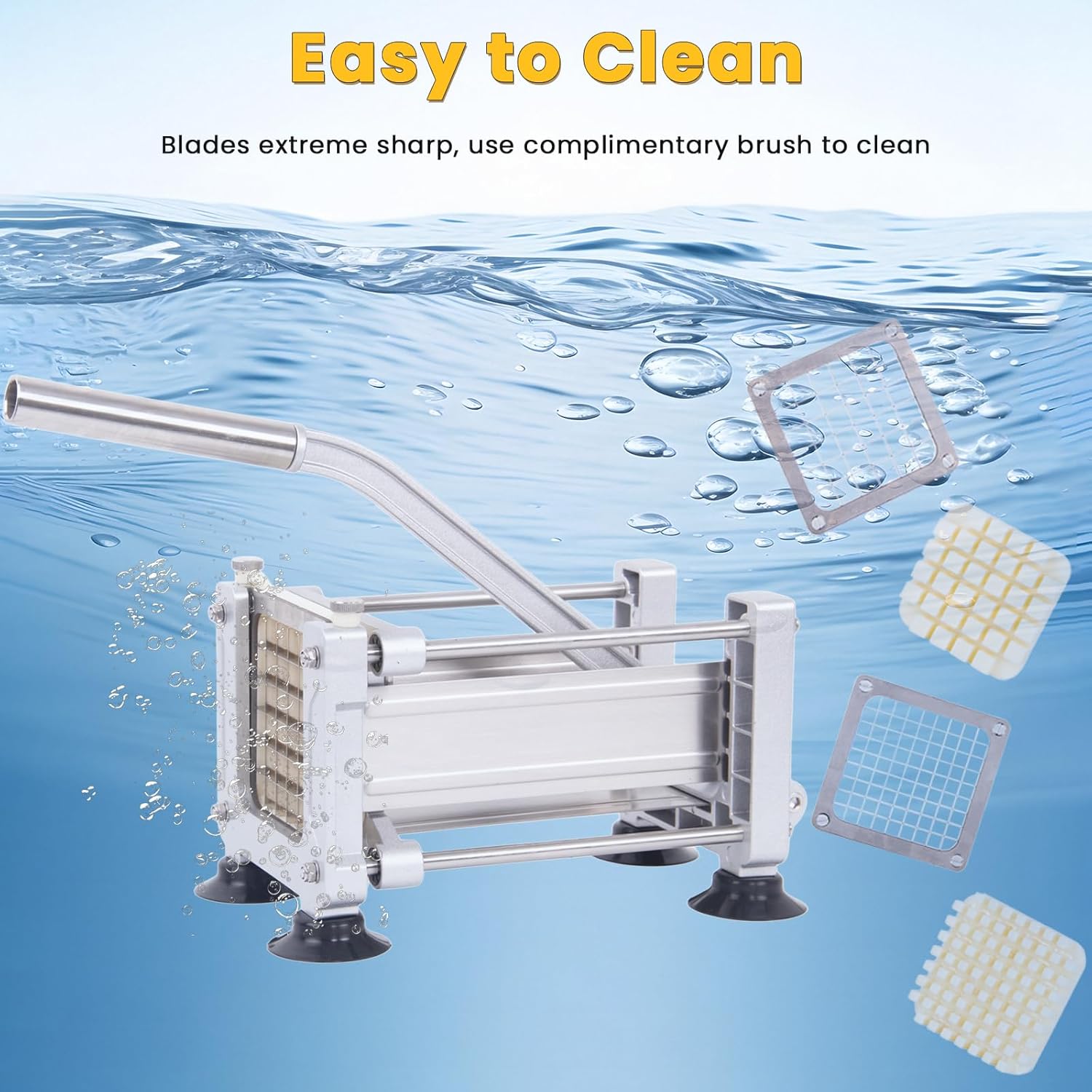 - EASY TO CLEAN & STORE – Removable blades and pusher plate are dishwasher safe for hassle-free cleanup. The can place the potato cutter in the sink and rinse directly with the tap for quickly removes any stuck-on food. Its compact design stores easily in a cabinet or comes apart to fit back in its box.