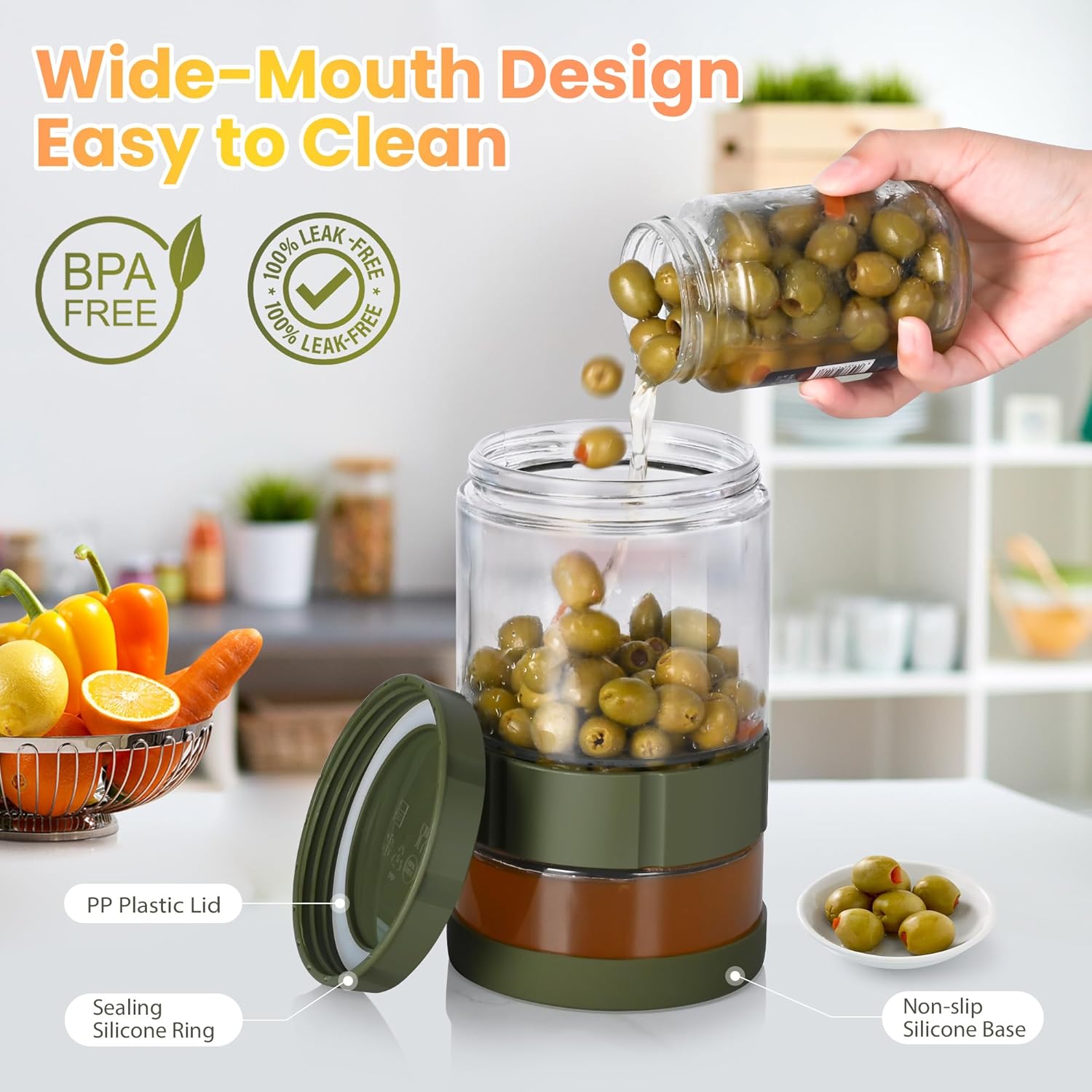 - HIGH QUALITY MATERIALS & LARGE CAPACITY: The olive jar is made of lead-free glass, and the lid and filter are made of BPA-free PP plastic to ensure safety and long-lasting durability. All components are dishwasher safe, refrigerator safe, recyclable, and durable. The pickle jar with strainer has a large capacity of 1600 ml/56 oz, with the top half having a capacity of 1100 ml/38.7 oz and the bottom half having a capacity of 500 ml/17.6 oz to meet the large capacity demand