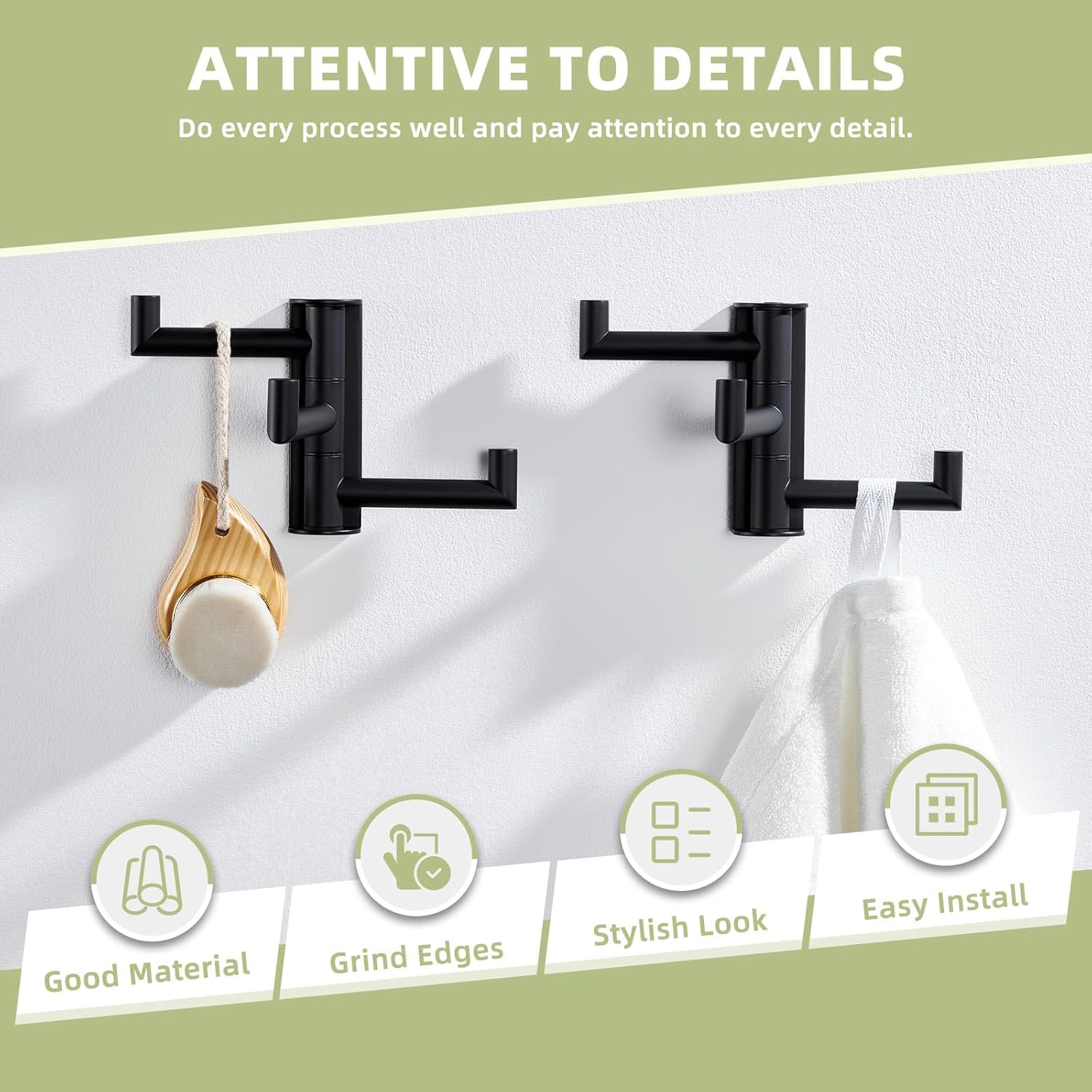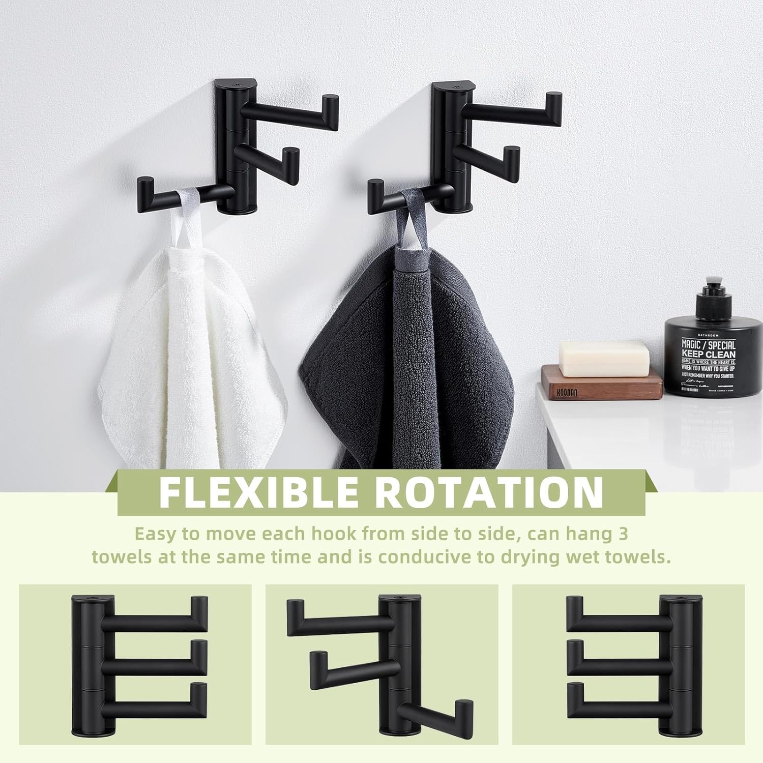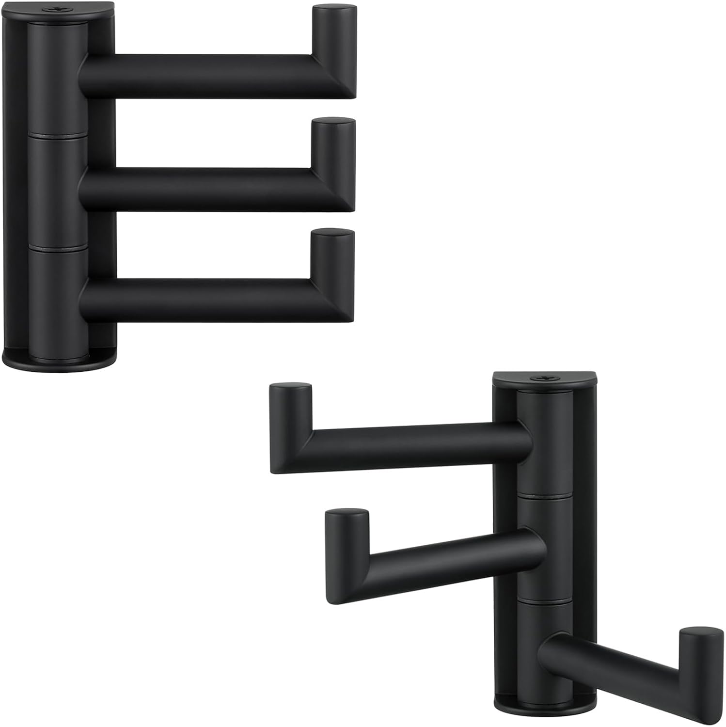 Suyar Towel Hook for Bathroom, SUS 304 Stainless Steel Swivel Coat Robe Holder with 3 Foldable Arms, Wall Hook Matte Black, 2 Pack