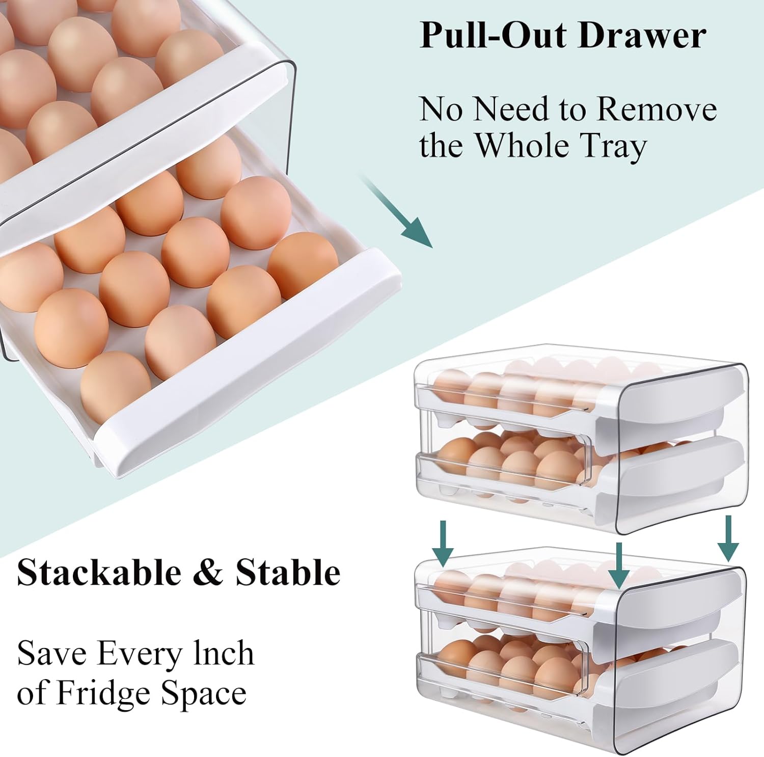 - 【Smooth Drawer Design – Easy Access to Eggs】 Convenient pull-out drawers glide smoothly for easy egg access without lifting a lid or removing the entire box. Prevents cracking and keeps eggs neatly in place.