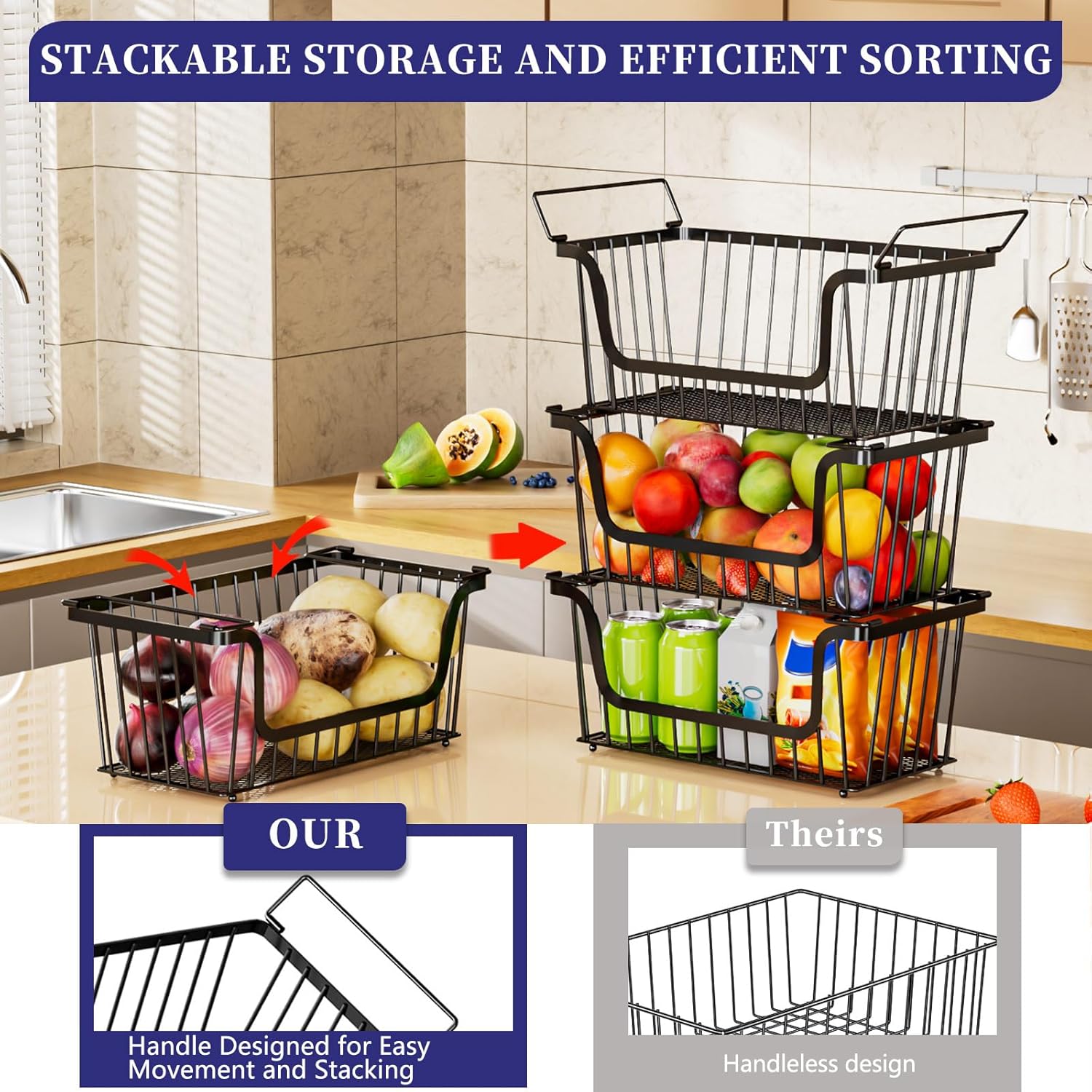 - MULTIFUNCTIONAL - STORAGE SPACE INCREASED BY 50%: The U-shaped stackable design shelf baskets is carefully crafted from thickened and reinforced high-quality metal. Whether it's for kitchen countertop storage or pantry organizers and storage, fruit basket,storage shelves, garage shelving, wire shelving can effectively utilize the vertical space for 50% more storage.