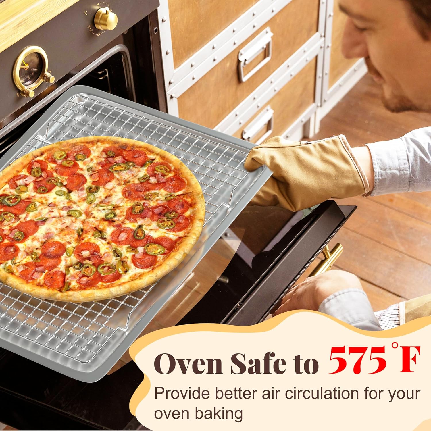 - OVEN & DISHWASHER SAFE: This wire rack for baking sheet has excellent heat resistance up to 575℉ oven baking, you can safely use it for roast, grill, smoke, dry. Besides, you can safely put the bread cooling rack into the dishwasher for cleaning. If need to hand wash, just soak it in mild soapy water and the stains will be easily removed