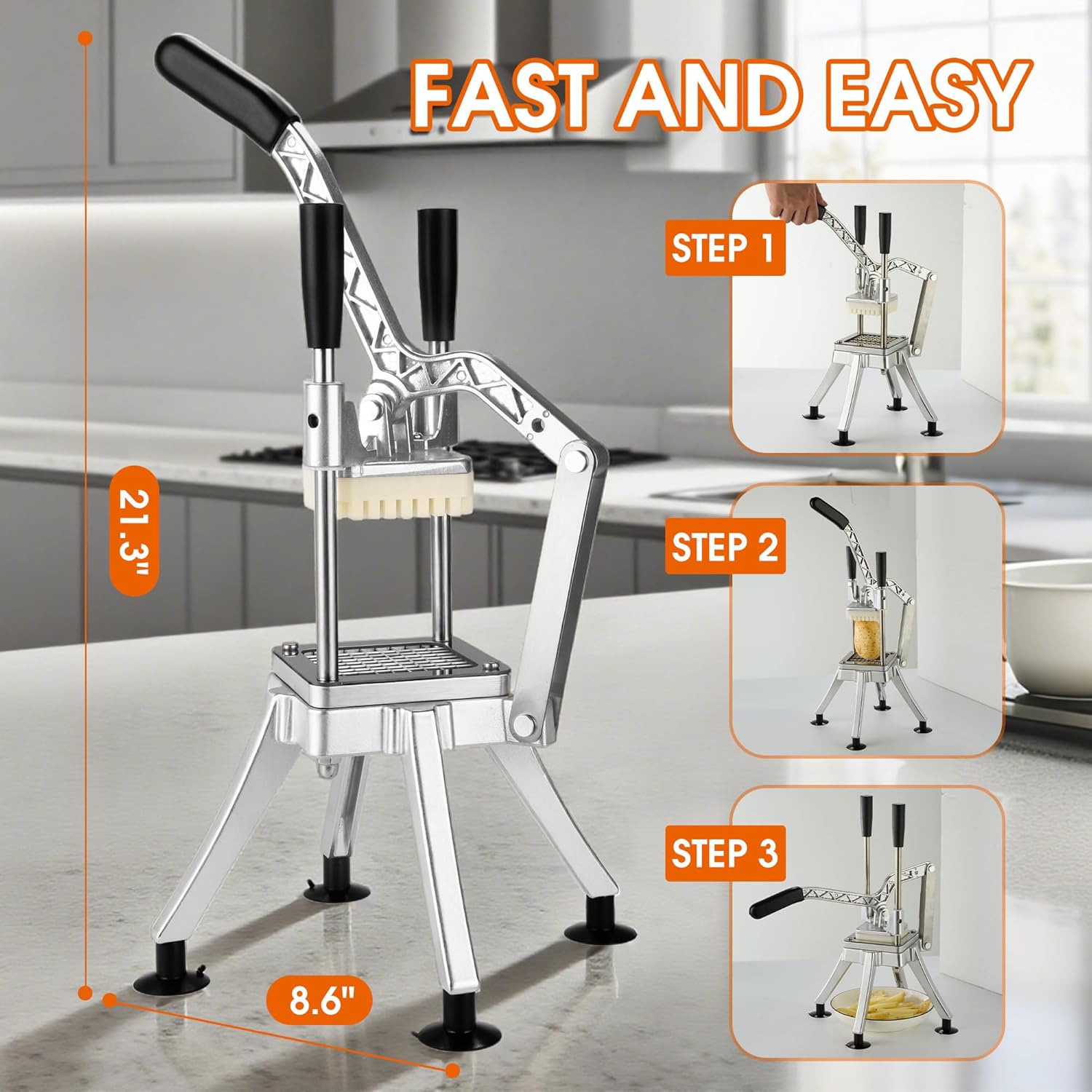- 【Effort-Saving and Efficient】The ergonomic pull-down handle uses a lever principle to save labor and time. You can easily press the handle to chop vegetables and fruits on the sharp blades. Using the commercial chopper, you can easily make french fries and vegetable salads without much effort