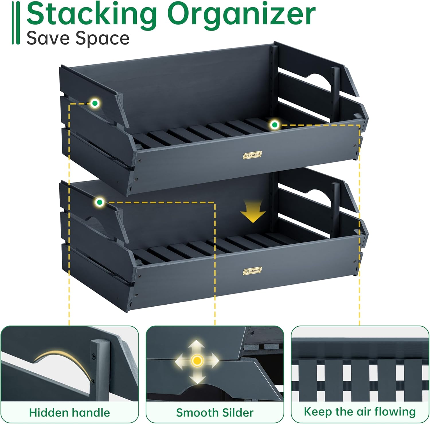 HABAU Wood Potato Onion Storage Bins - Wooden Stackable Produce Basket - Fruit Vegetable Storage for Kitchen Pantry Organization, Set 2 Pieces