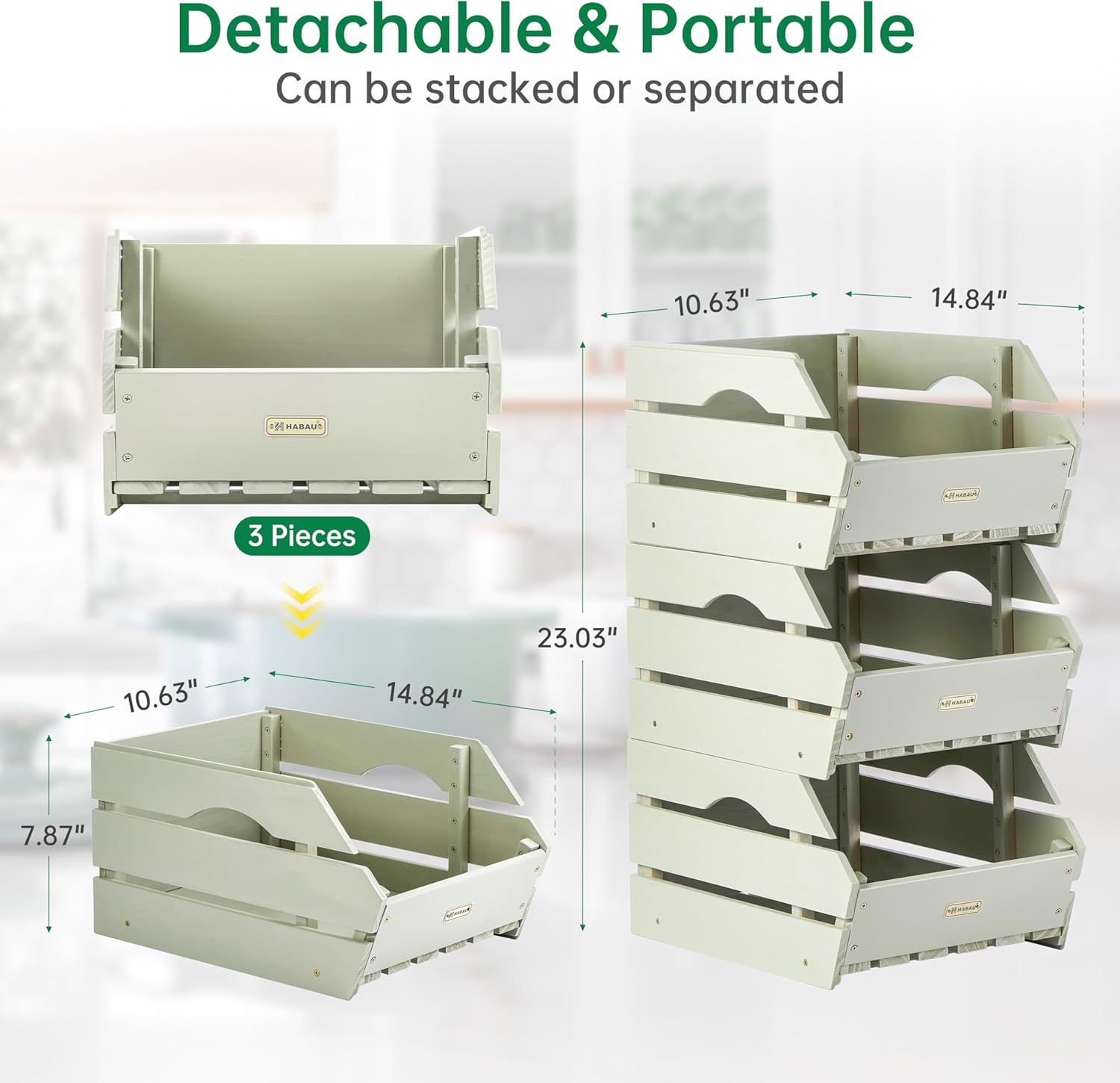 HABAU Wood Potato Onion Storage Bins - Wooden Stackable Produce Basket - Fruit Vegetable Storage for Kitchen Pantry Organization, Set 3 Pieces