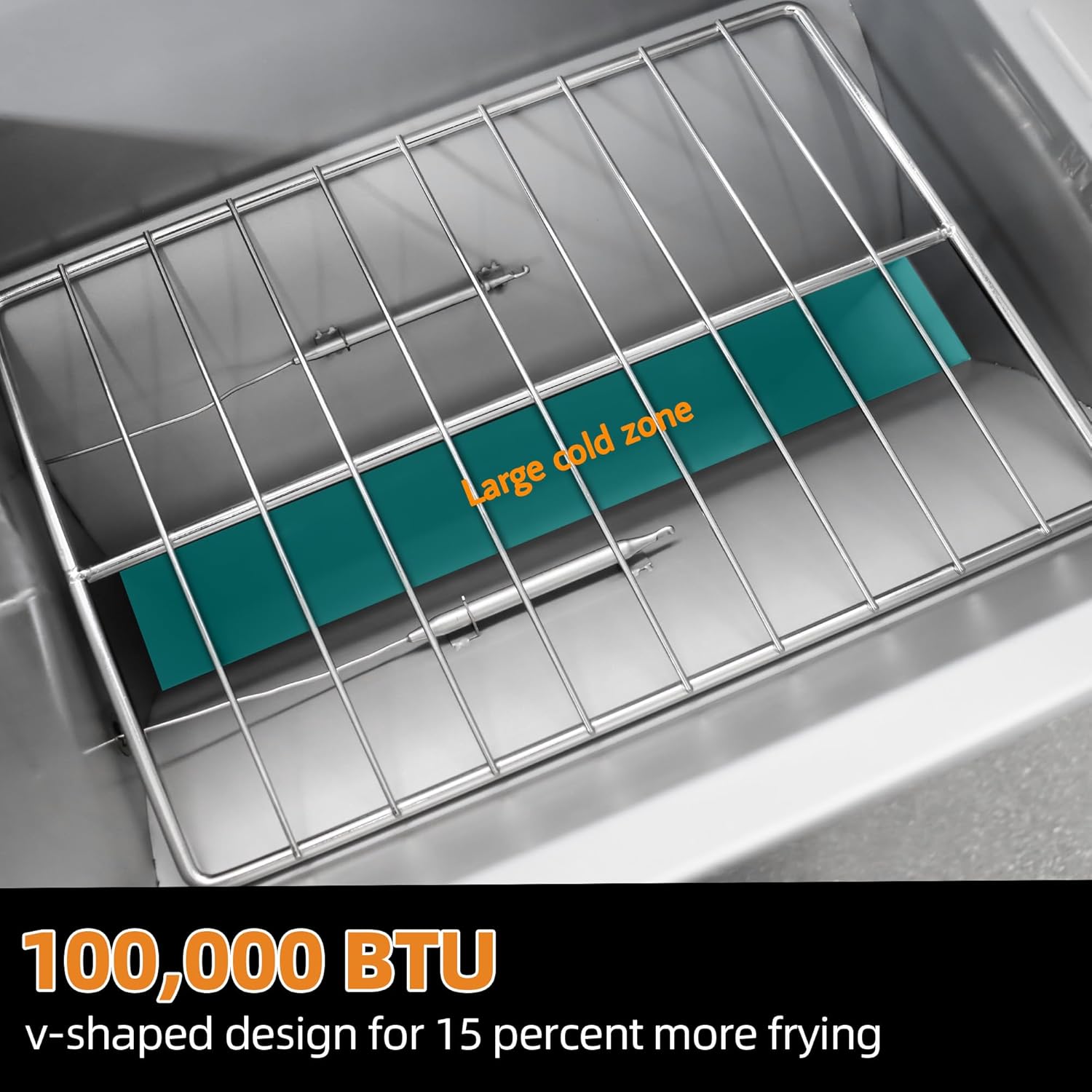 - Large Cold Zone Technology:Reduce taste transfer and extend oil life by 40% with the innovative large cold zone, capturing food particles outside the heating area. Paired with rapid, even heat distribution from external plates, this minimizes burning and preserves oil clarity for healthier frying. Twin baskets with plastic-coated handles stay cool, enabling quick swaps during rushes. Perfect for high-volume commercial kitchens serving diverse menus—from crispy shrimp to golden onion rings!