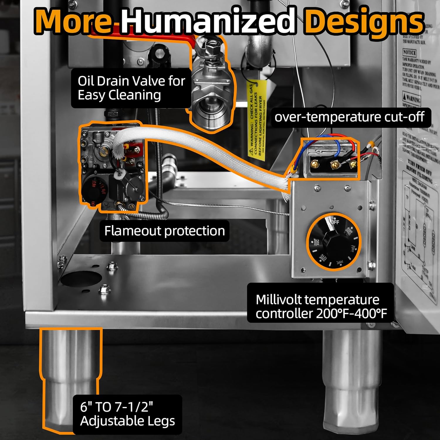 - Industrial Safety & Precision Control:Engineered with CSA-certified safety, this natural gas fryer features behind-the-door millivolt control for intuitive temperature adjustments (200°F–400°F). Over-temperature protection automatically cuts off gas at 450°F (232°C), exceeding commercial safety standards. Reinforced 430 stainless steel construction resists corrosion, while flame failure protection prevents hazards. Four adjustable stainless steel legs stabilize on uneven food truck terrain