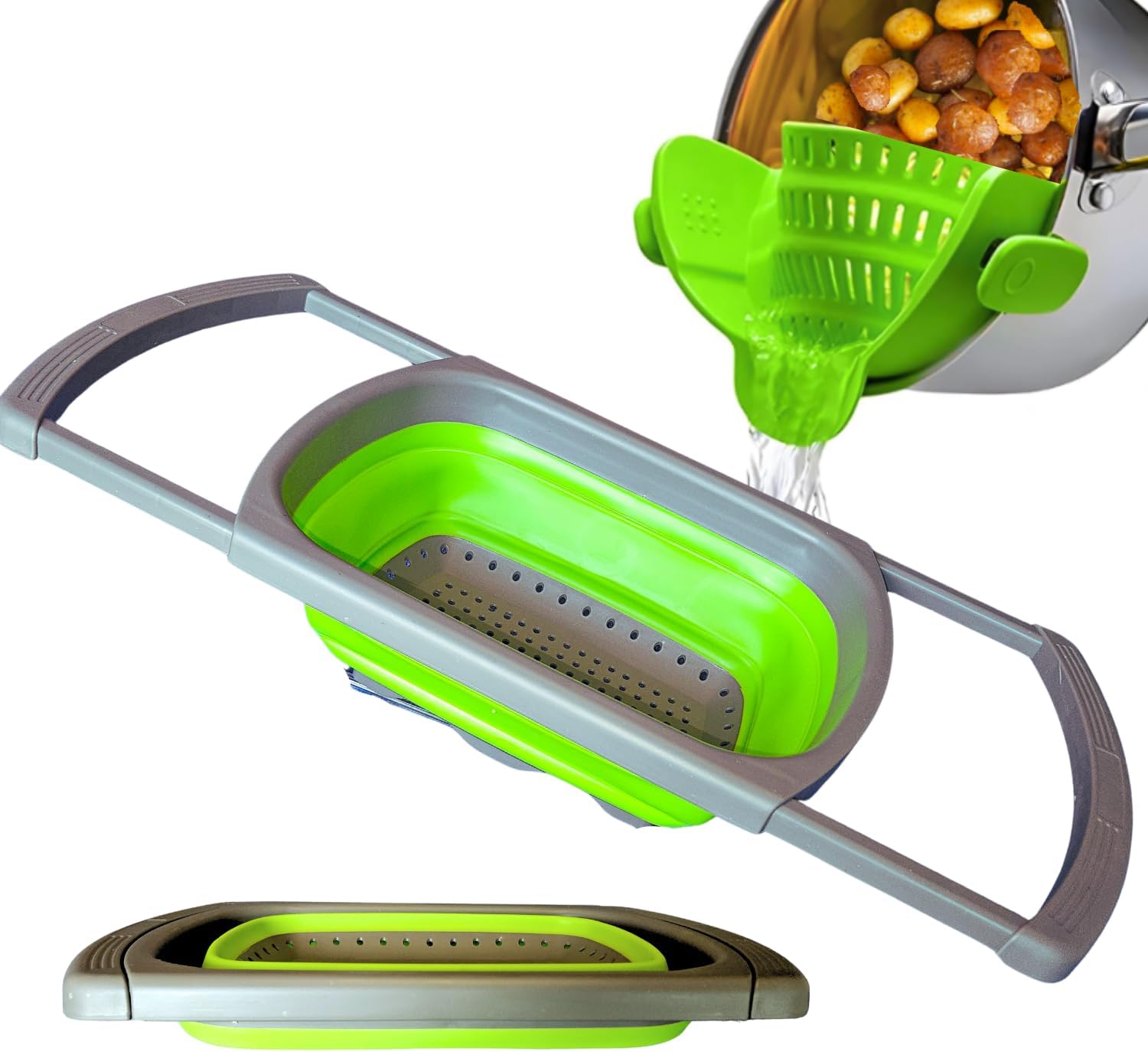 - High Quality Kitchen Strainer Duo: Premium silicone material, collapsible, extendable, multifunctional kitchen strainers, collanders. Perfect for washing fruits and vegetables, preparing salads. A clip-on strainer is a perfect tool for straining meats, filtering grease, and even as a strainer for pasta.