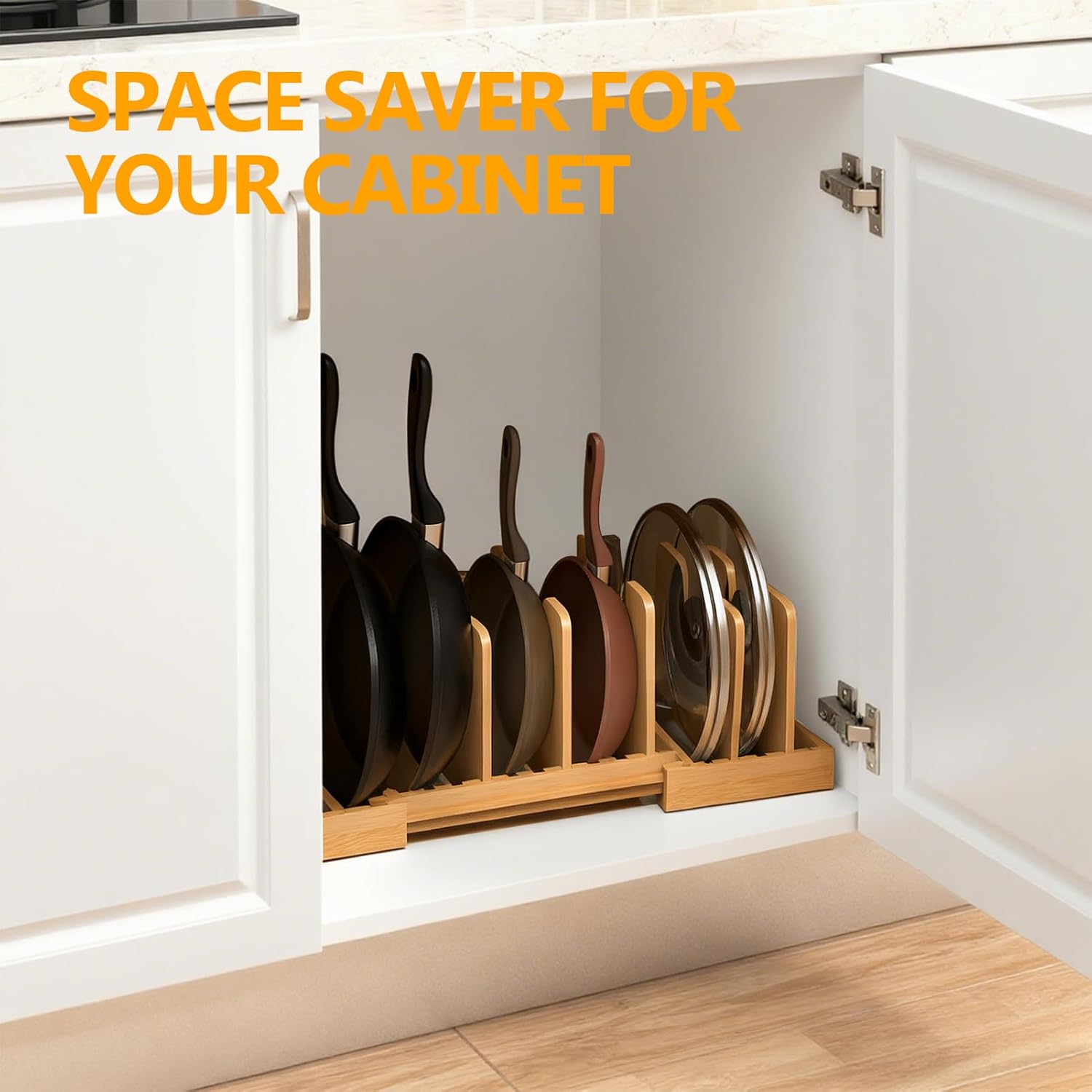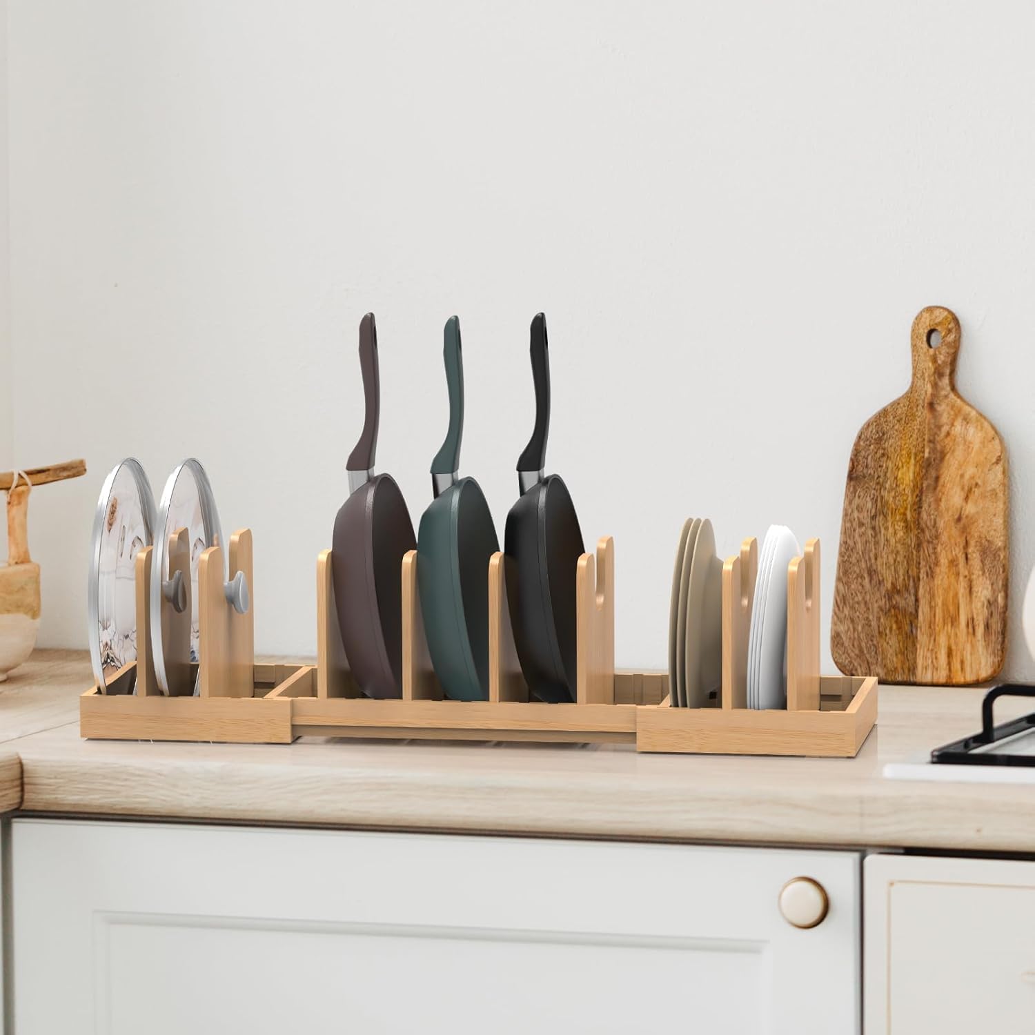 Expandable Pot Lid Organizer with 8 Removable Dividers, Bamboo Pot and Pan Organizer for Kitchen Counter or Cabinet