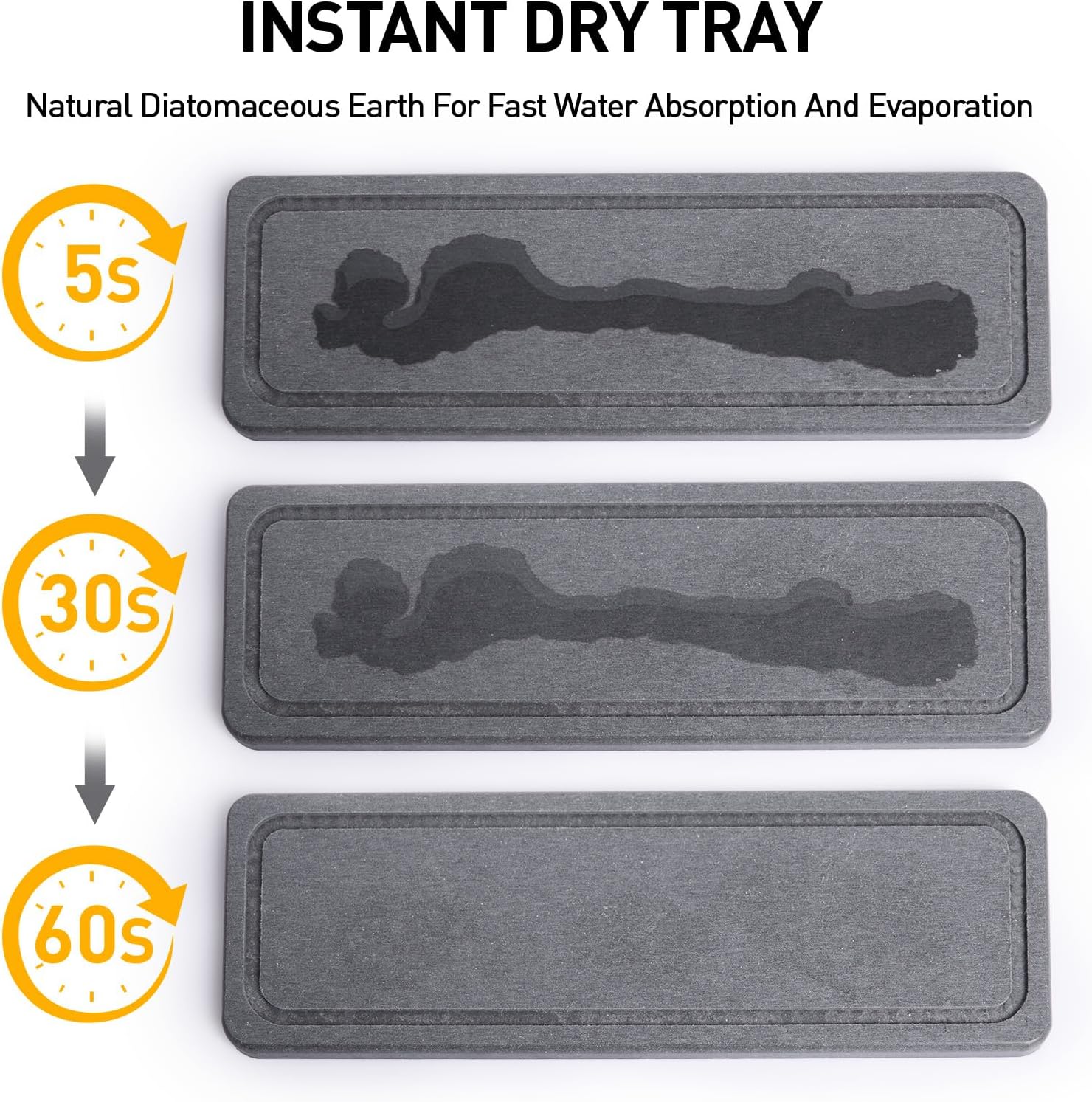 - 【QUICK DRY TRAY】Moforoco's soap dispenser set uses a new material, diatomaceous earth. Experiments have shown that diatomaceous earth has stronger water absorption, is environmentally friendly and safe, and has the characteristics of quick drying. It is very suitable for use around the sink and sink, so that the kitchen sink is always dry.