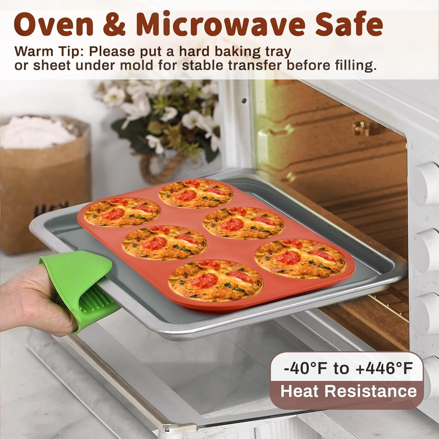 - Temperature Range: Silicone muffin top pan can withstand temperatures from -40°F to 446°F (-40°C to 230°C), safe for the oven, microwave oven, freezer, refrigerator and dishwasher
