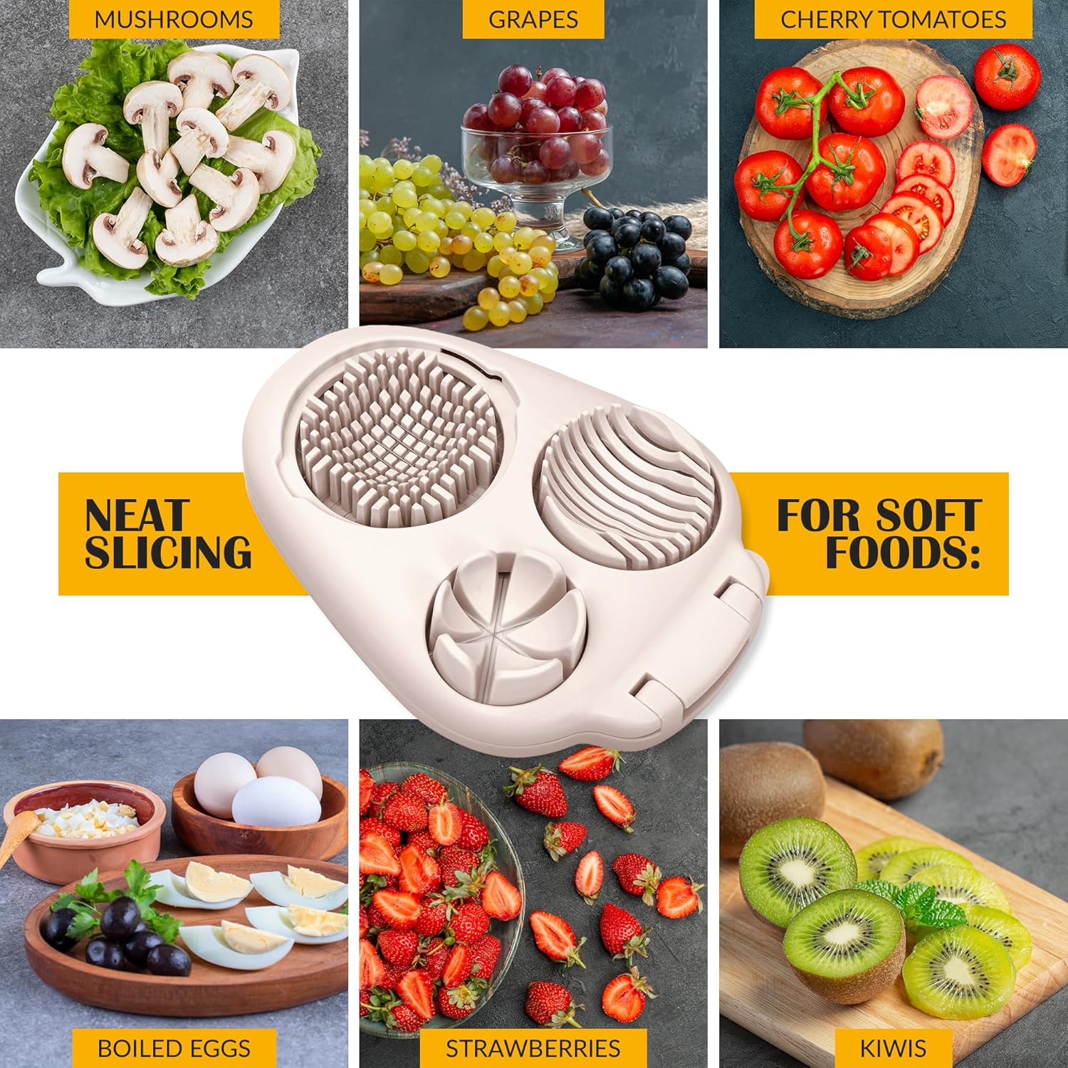 - 𝗨𝗻𝗶𝘃𝗲𝗿𝘀𝗮𝗹 𝗞𝗶𝘁𝗰𝗵𝗲𝗻 𝗧𝗼𝗼𝗹: The egg dicer for hard boiled eggs is an essential everyday tool; you can use it for eggs as well as a strawberry slicer, mushroom slicer, tomato slicer, grape slicer, kiwi slicer, olive slicer and other non-solid foods; every dish will taste delicious, and also look amazing