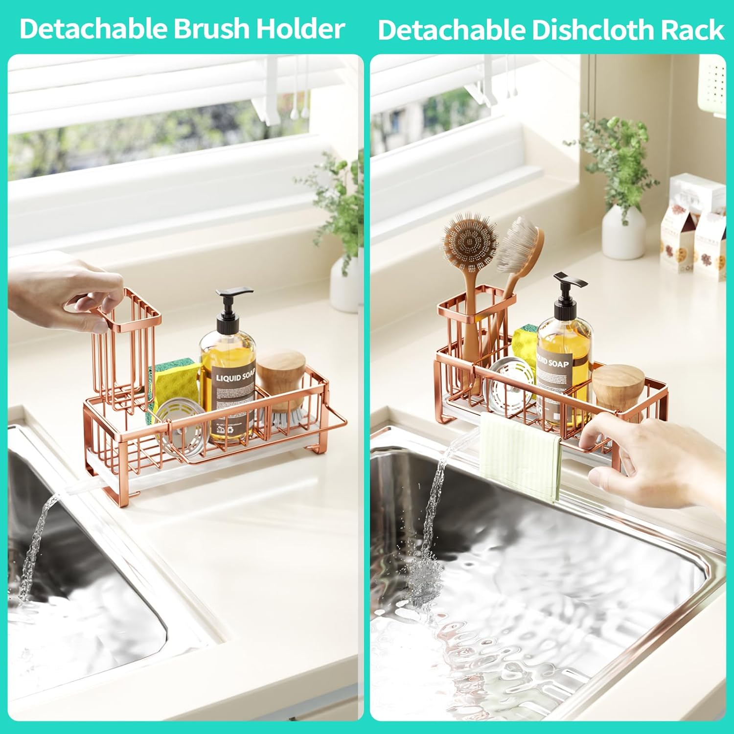 HapiRm Sponge Holder for Kitchen Sink - Self-draining Sink Caddy with Brush and Dishcloth Holders, Stainless Steel Kitchen Organizer for Countertop - Rose Gold