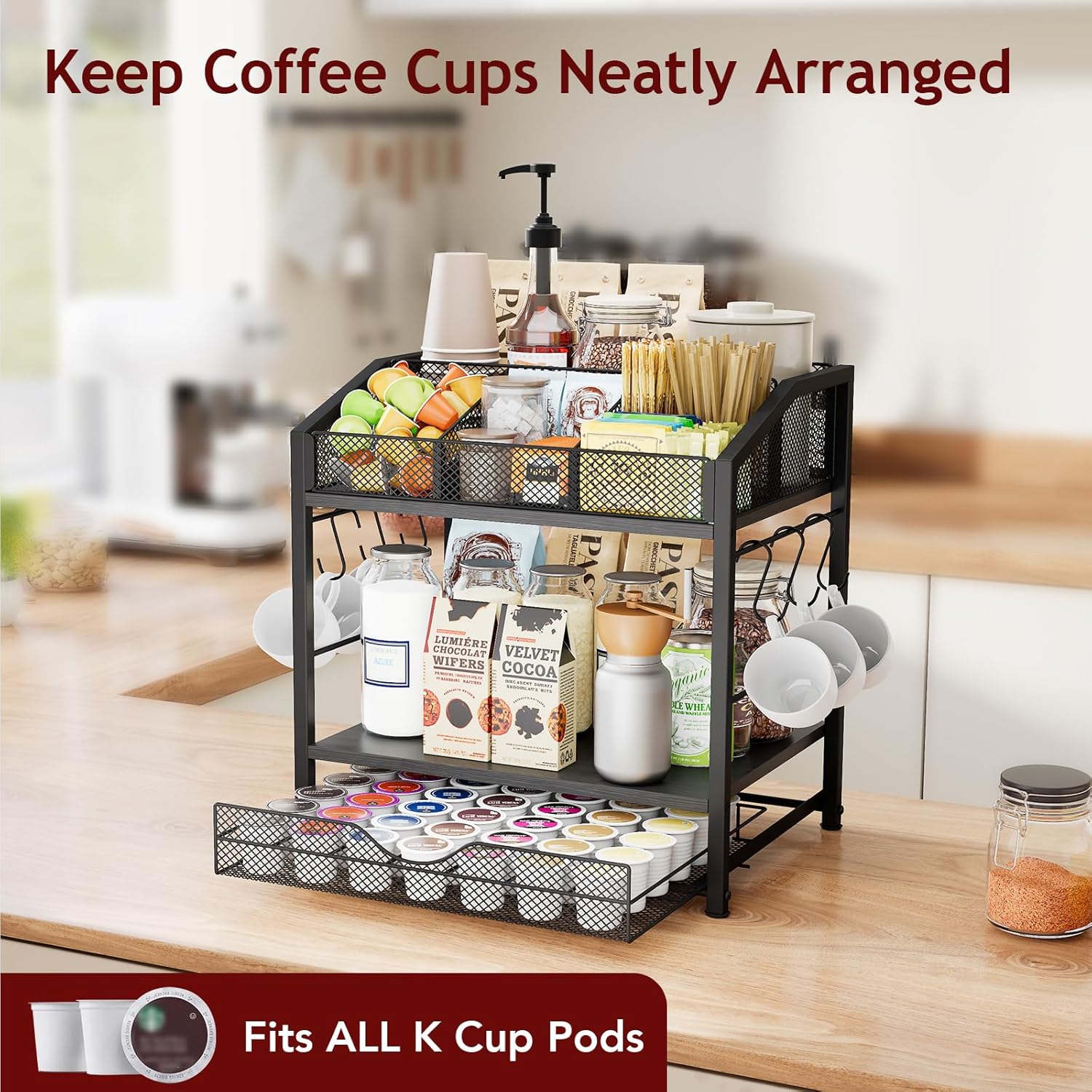 - [Designed to Fit into Your Life, Effortlessly] Whether you’re setting up a cozy home coffee bar, upgrading your office breakroom, or adding convenience to a hotel lobby, this coffee bar organizer for countertop blends in seamlessly. It keeps all your essentials within reach while saving precious space.