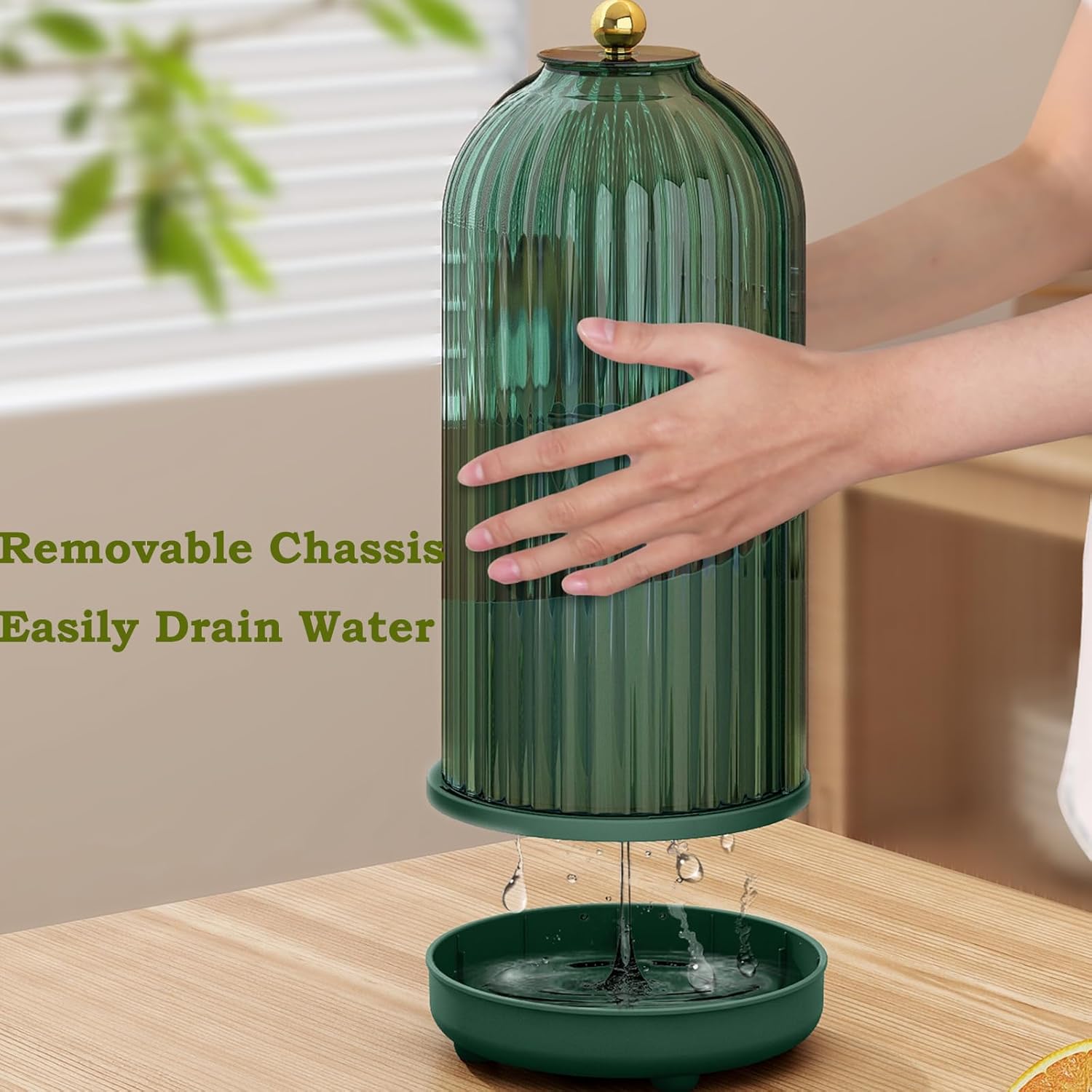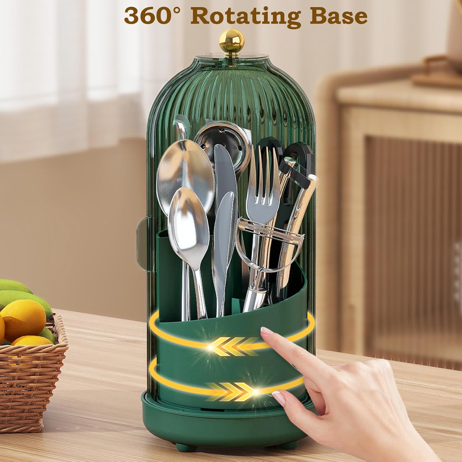 JEESA Utensil Holder with Lid, 360° Rotating Flatware Organizer for Cutlery Spoon Fork(H Less 8"), Silverware Caddy Organizer Drainage Dustproof Flatware Holder Kitchen Countertop Storage, Green