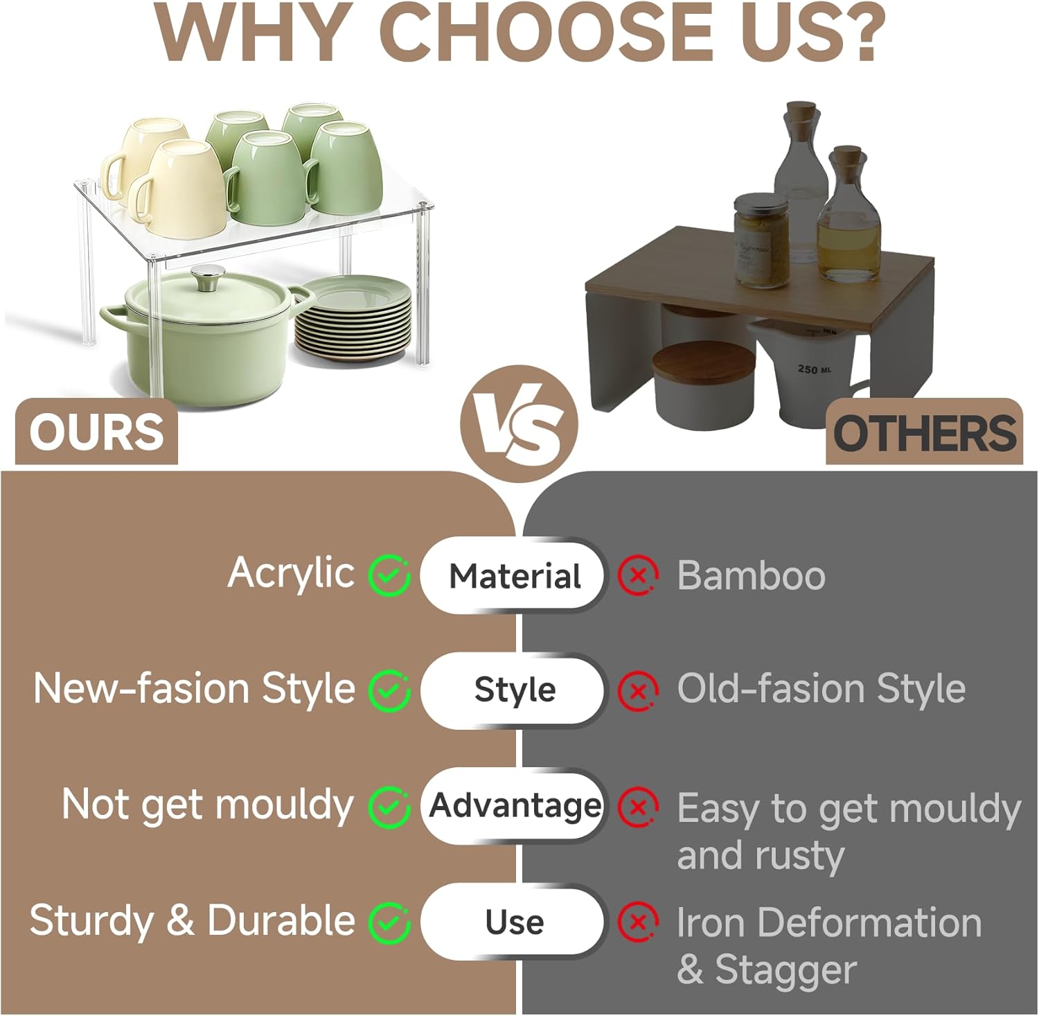 - 【MORE CONVENIENT TO INSTALL THAN OTHERS - JUST BY HANDS IN 3 STEPS!】First remove the protective film of the clear acrylic shelves on both sides, then tighten the screws on the support legs, and finally paste the anti-slip adhesive on the bottom of the support legs, and the installation can be completed in just a few minutes. (Note: The kitchen cabinet organizer are equipped with two sizes of legs, the short ones are for small sizes and the long ones are for large sizes.) We also offer non-slip adhesive dots, which can safely hold the balance fulcrum of the support leg.