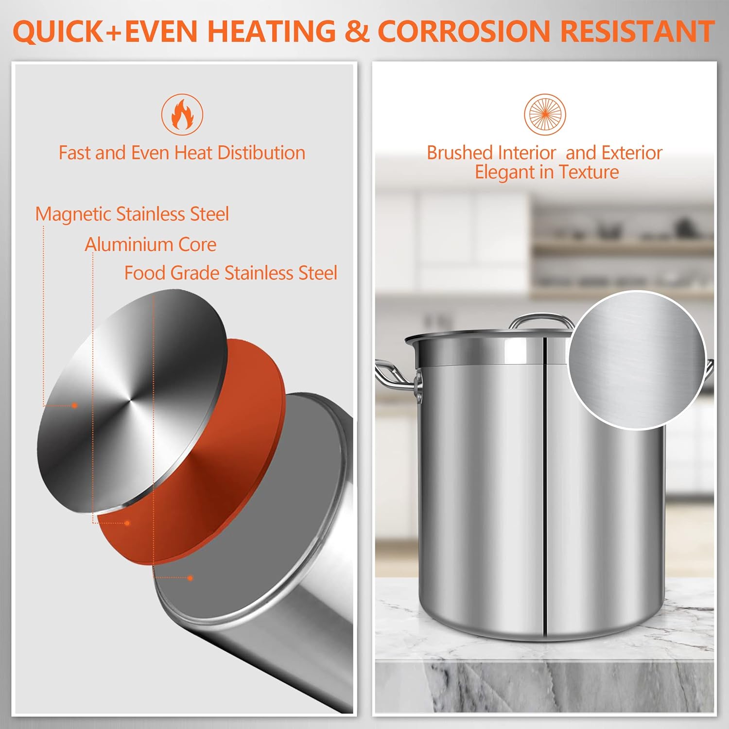 - COMMERCIAL GRADE: Under strict industrial design standards, the non-nickel stainless steel soup pot features latest unibody tri-ply construction techne on the bottom while leaving no gap. It provides fast and even heat distribution, prevents dirt and corrosion, and extends the service life. The heavy stainless steel rivets and solid handles will prevent scald, allow for comfortable and secure carrying around the kitchen.
