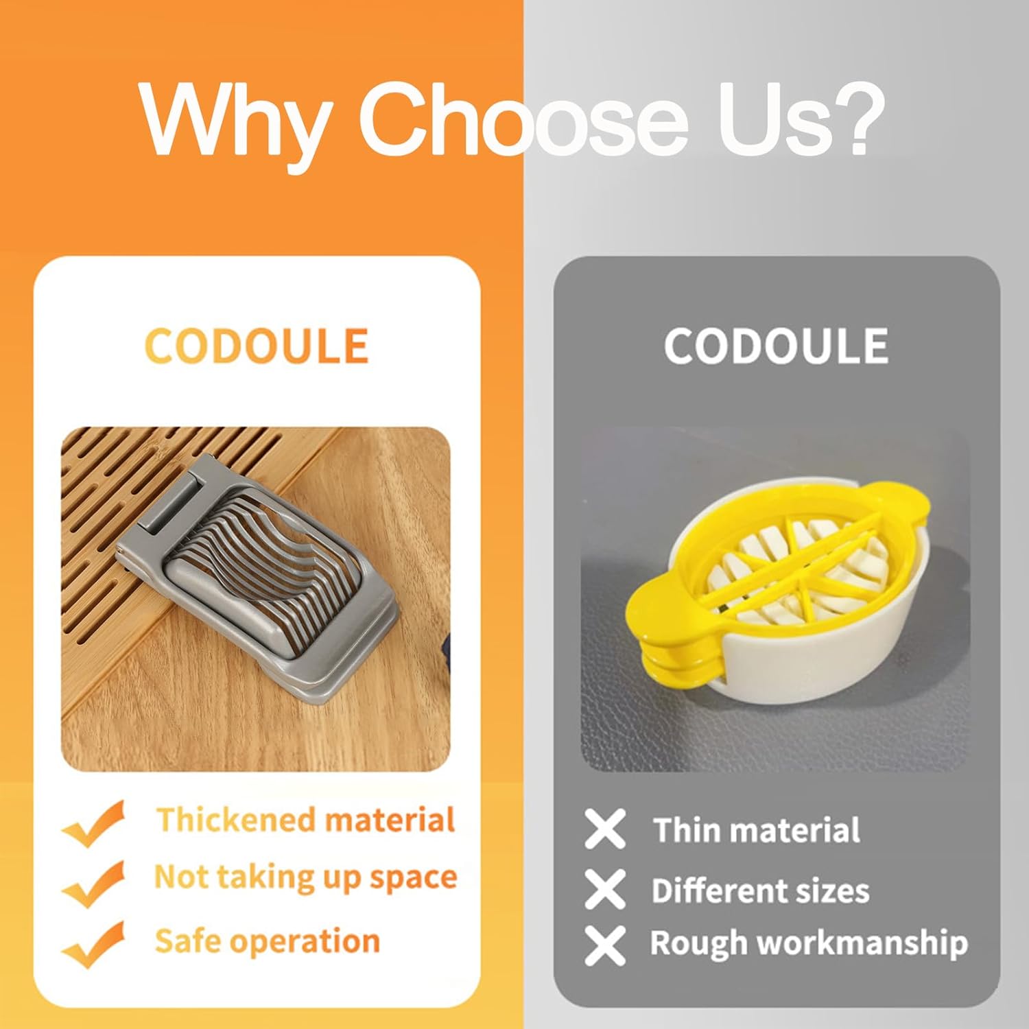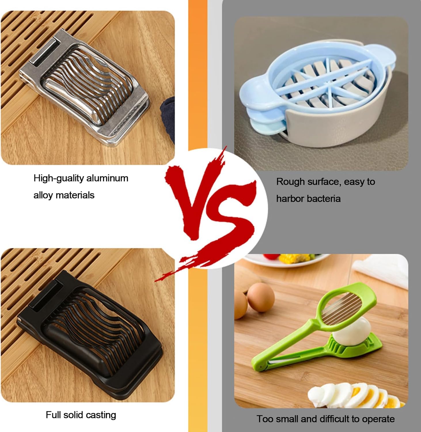 - 💪 Durable Heavy-Duty Aluminum Body Crafted from premium cast aluminum, this egg cutter is built to last. Its robust structure resists bending or warping, ensuring long-term performance in any kitchen.