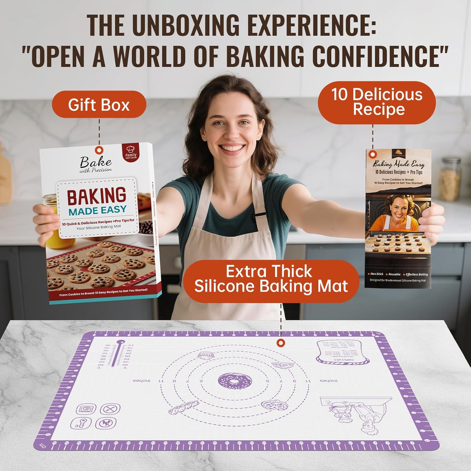 Non Stick Silicone Pastry Mat for Dough Rolling, Silicone Baking Mat for Bread, Cookie, Macaron, Pizza, Surdough, Non Slip Silcone Mat for Counter, Baking Suppliers with 10 Useful Recipes