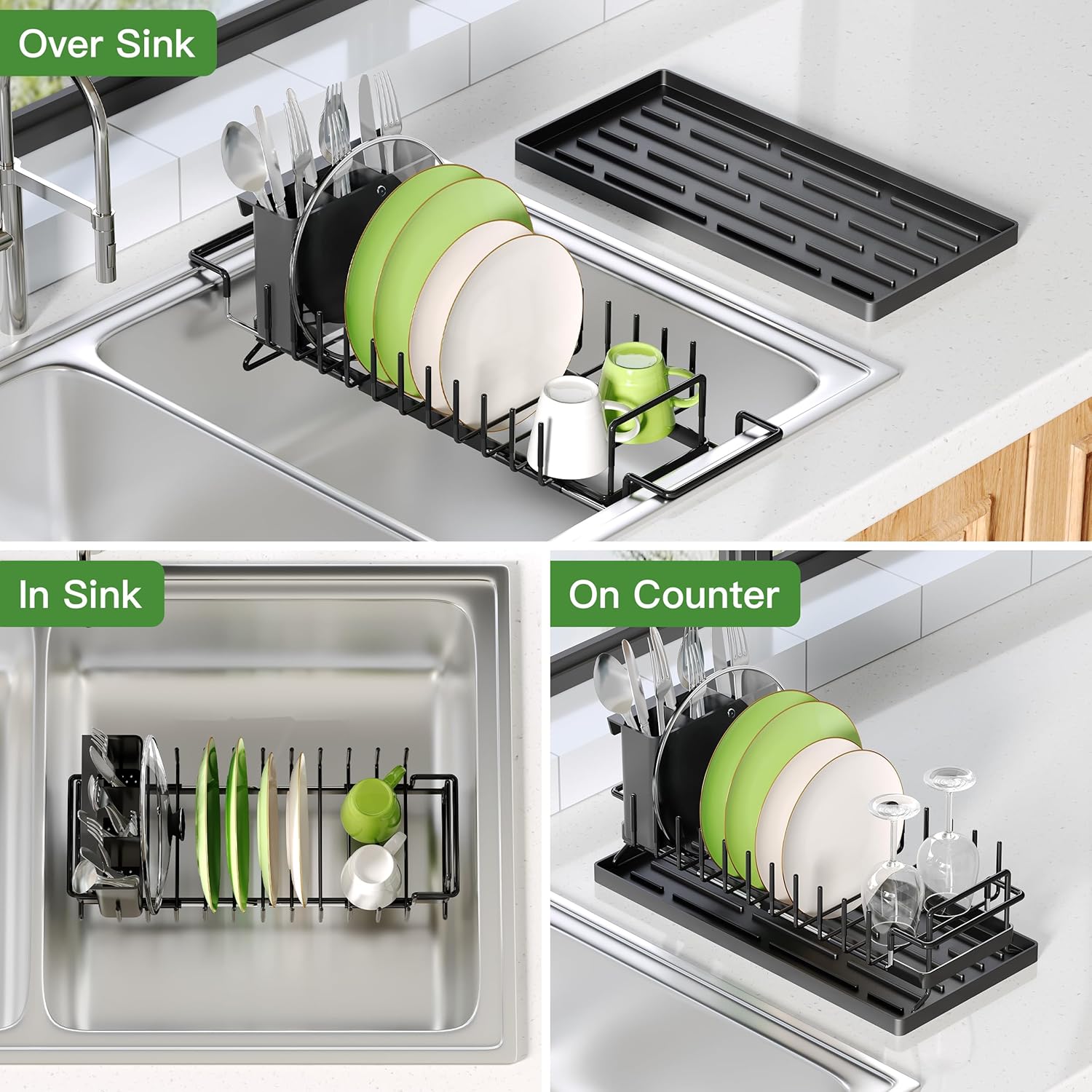 Dish Drying Rack Over the Sink Expandable In Small Black Drainer Dry for Kitchen Counter, Metal Stainless Steel Compact Dishes Drain with Tray, Space Saving Extendable Modern Plate Strainer Holder