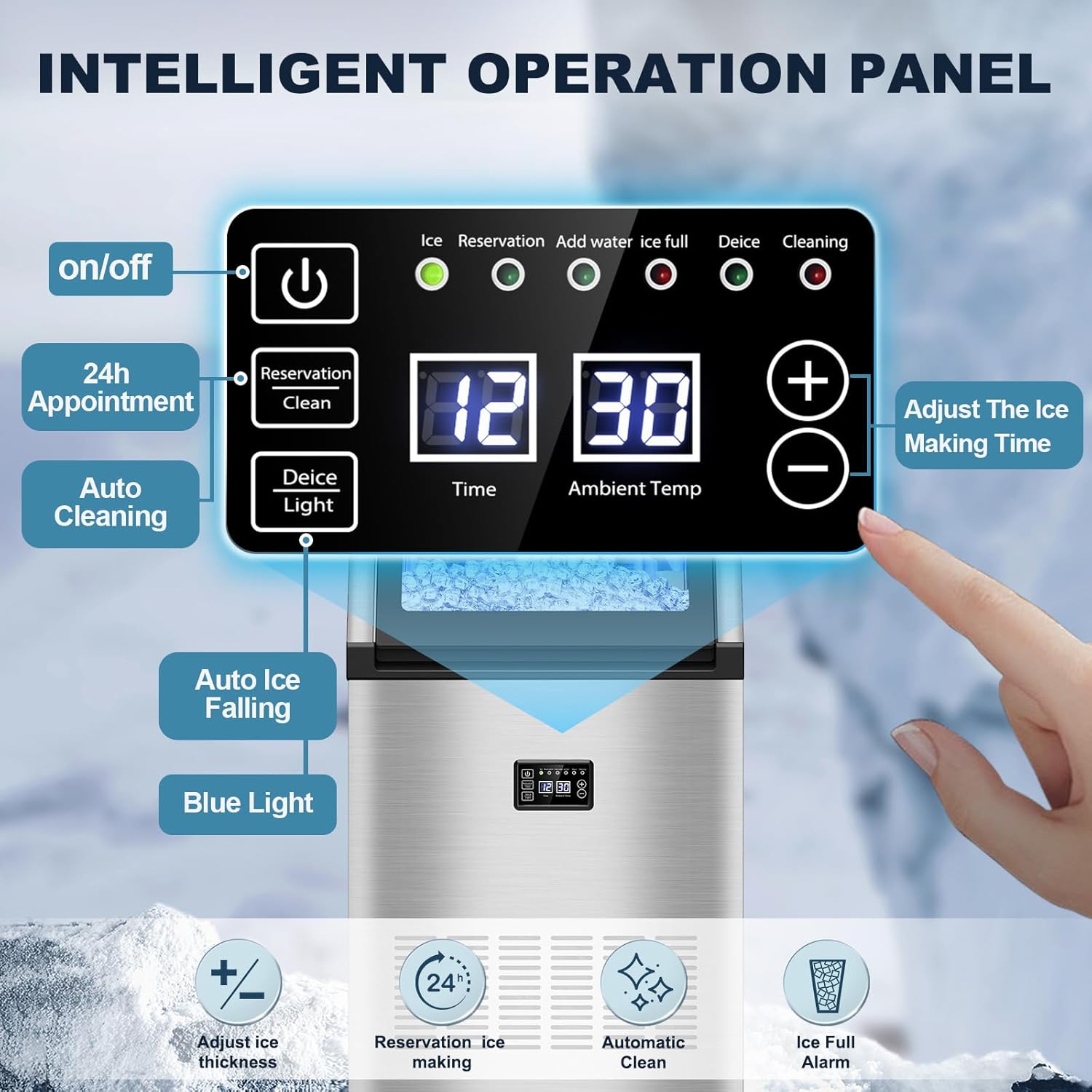 - Smart LCD Control for Seamless Operation: The ice maker take full control with an intuitive LCD panel that transforms ice-making into a hassle-free experience. Set schedules with the 24-hour programmable timer, activate the self-cleaning function at the touch of a button, and monitor performance with real-time error alerts and soft blue LED lighting. Precision meets simplicity, offering a sleek, user-friendly interface designed for effortless operation.