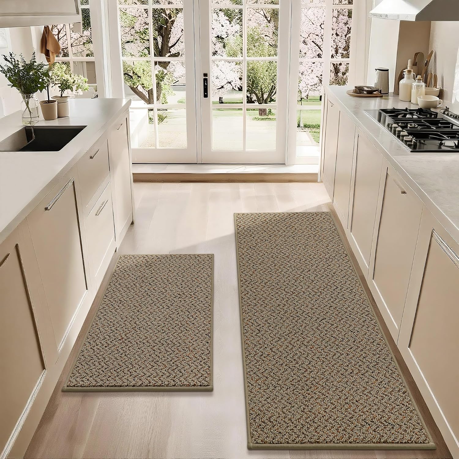 - Aesthetic Design The kitchen carpet has a classic aesthetic style.Unique W-shaped textured weaving designs make kitchen rug serve as practical kitchen mat while adding decorative charm to your space.Our kitchen sink rugs are used for kitchen, hallway,sink,laundry,door entrances and more.Note: the colors of mats may vary under different light conditions.If you have any problem,please feel free to contact us