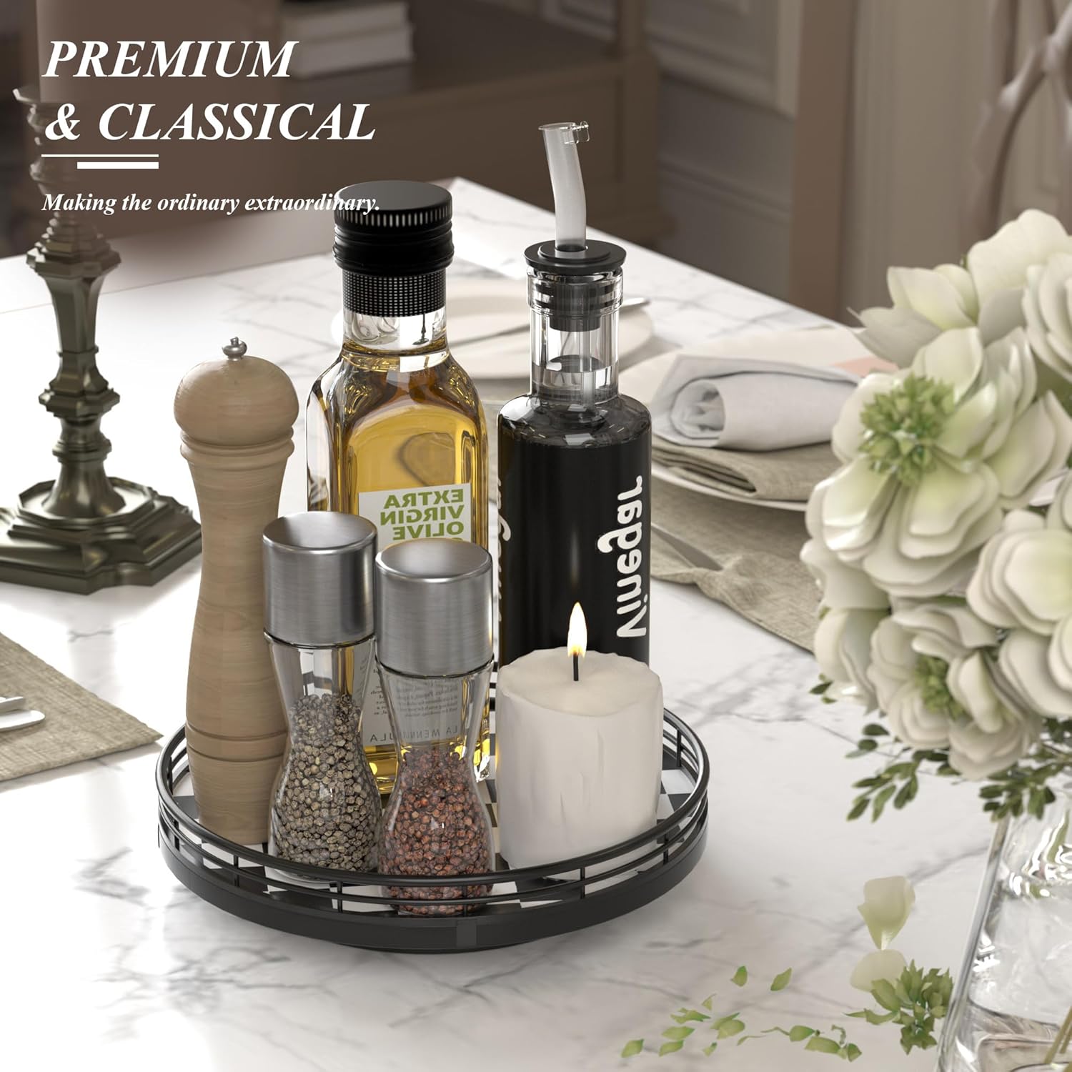 - COMPACT & DECORATIVE – Perfect as a mini decorative lazy susan, a small kitchen table centerpiece, or a table kitchen caddy, bringing both function and charm to your tabletop.