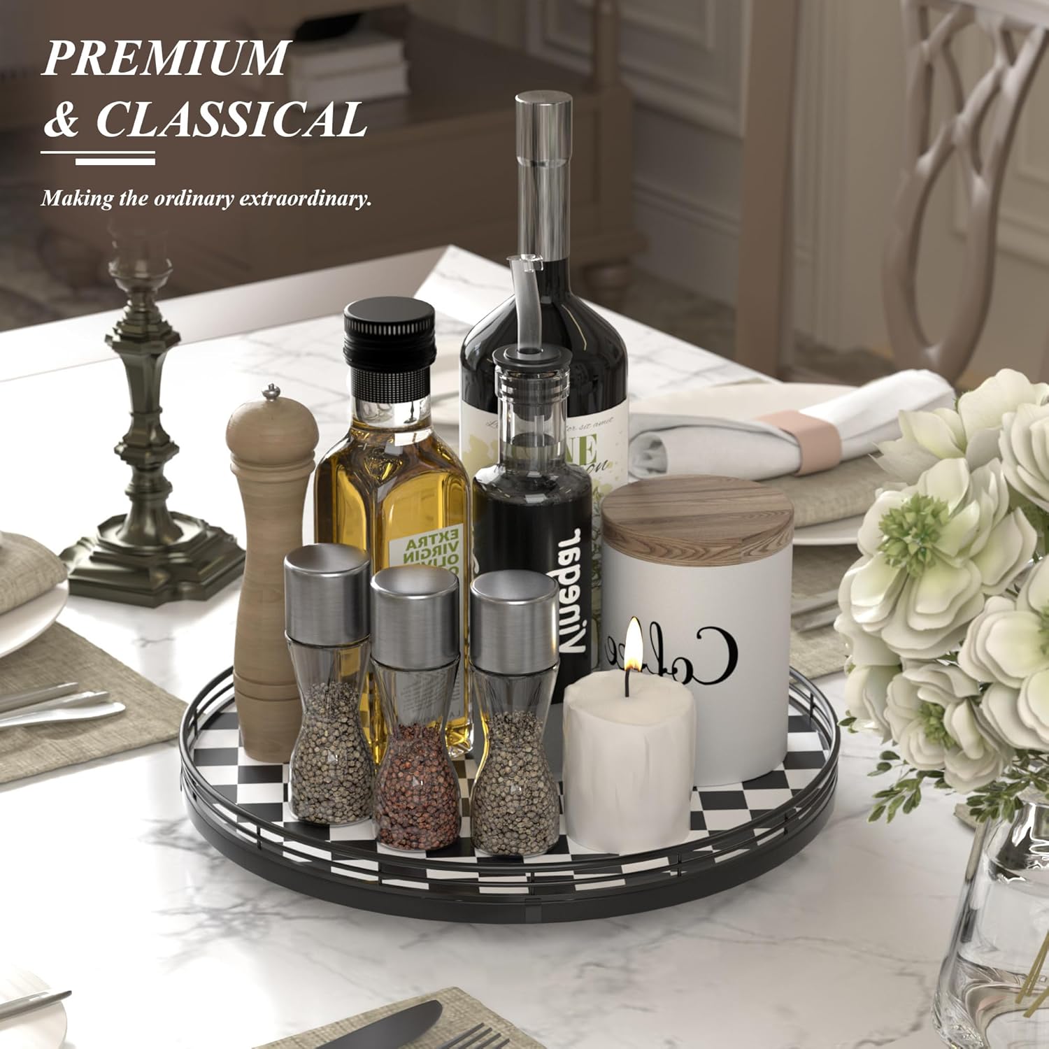 - QUALITY CRAFTSMANSHIP & STYLE – Built with a durable checkered oakwood base and iron frame. From a black check serving tray to a cute lazy susan for table top, it blends seamlessly with modern pottery barn decor styles.