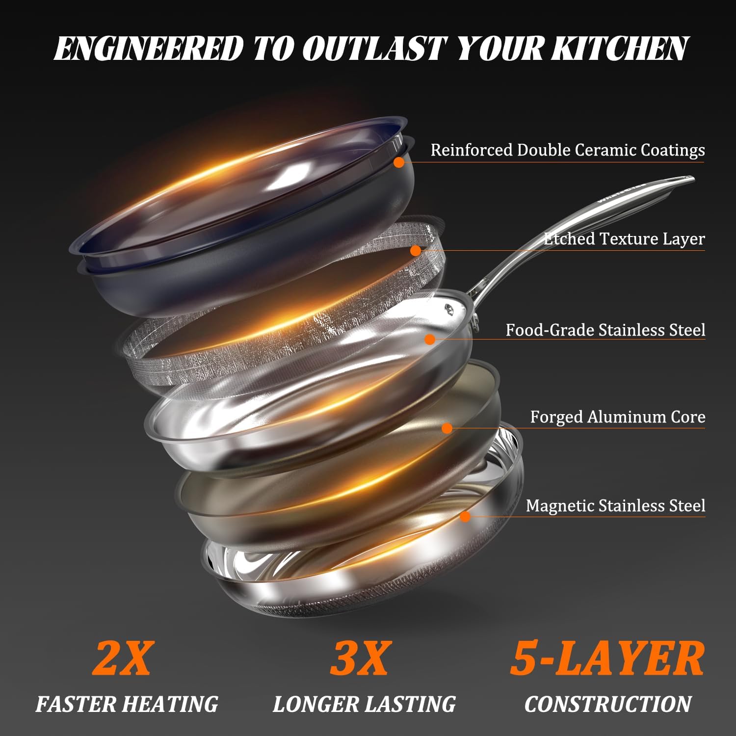 - Rapid & Even Heat Distribution: Built with a fully clad hybrid 3-ply stainless steel core and dual ceramic coating layers, this frying pan heats up quickly and distributes heat evenly across the entire cooking surface. The aluminum core, sandwiched between two layers of stainless steel, works with the dense dot-etched surface to promote micro-heat circulation—minimizing hot spots and enhancing flavor with every sear and sauté. Perfect for searing a steak to a crust while locking juices inside