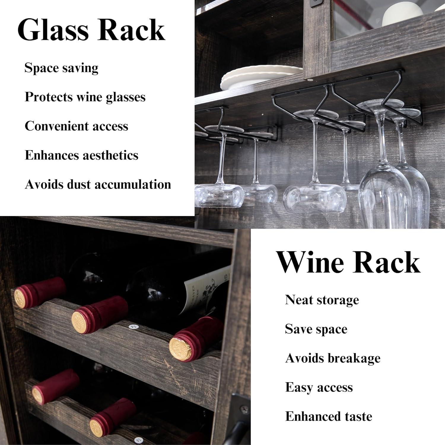 - Sturdy and Durable- This bar cabinet is made of solid wood, toughened glass, and MDF for durability. The metal parts are high-strength steel with a powder coating, making them rust and scratch-resistant. Wide wooden legs and thoughtful design enhance stability and load-bearing capacity. Equipped with an L-shaped locking wall anti-tipping plate, it prevents tipping and protects children or pets at home